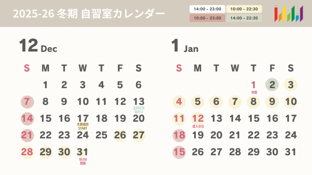 【12・1月】自習室カレンダーと冬期までの流れ。